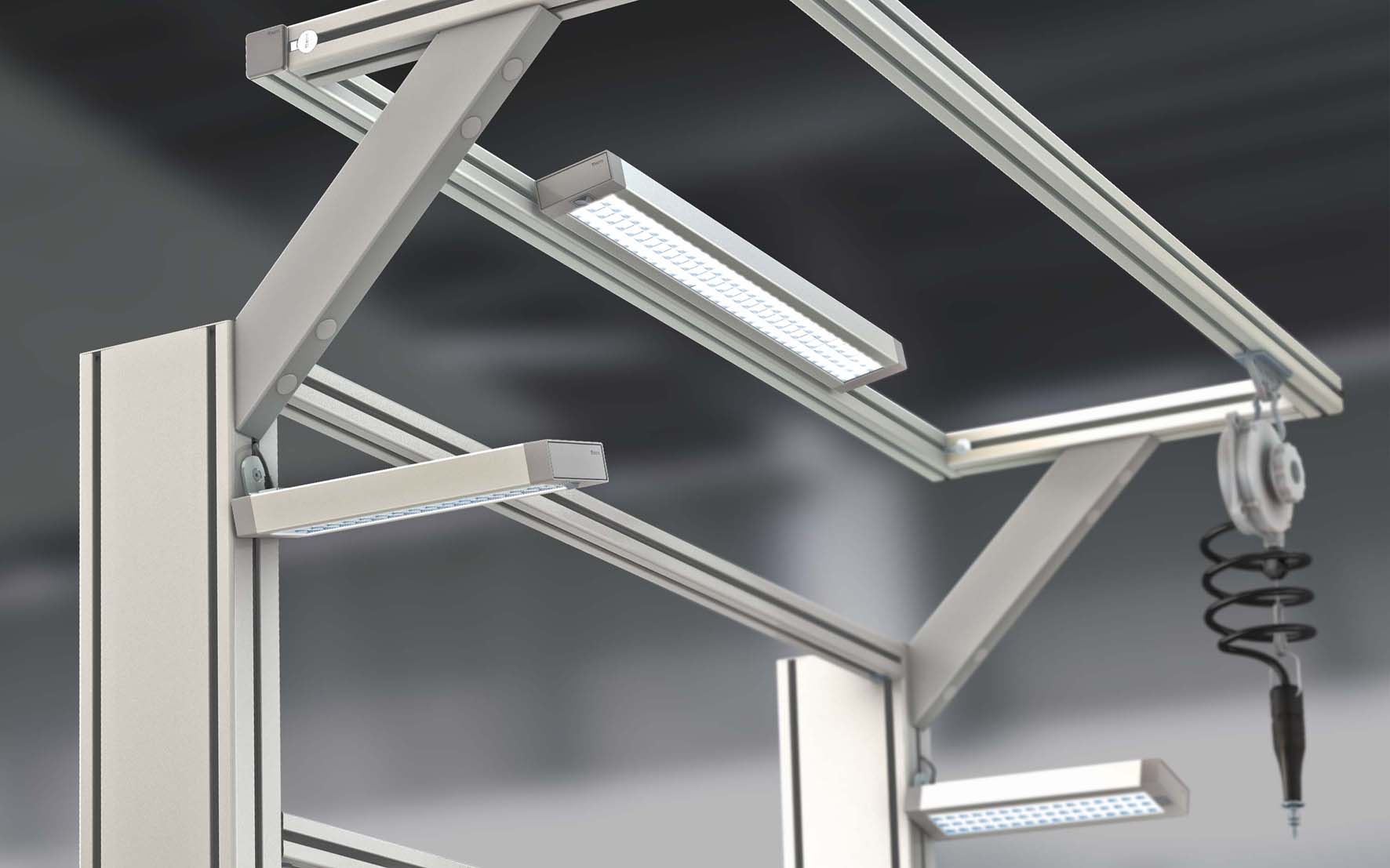 LED light fittings boast high performance and low energy consumption. Exhibiting a service life of up to 50,000 operating hours, the fittings require little maintenance and – in contrast to conventional lights – rarely need to be replaced. A modular lighting design is often a good choice for complex and sophisticated lighting scenarios. When using the building kit system from item, a work bench can be illuminated from three sides – without causing any shadows. In addition, simple plug-in connections dramatically reduce installation outlay and therefore offer the perfect lighting, even during complex assembly activities.