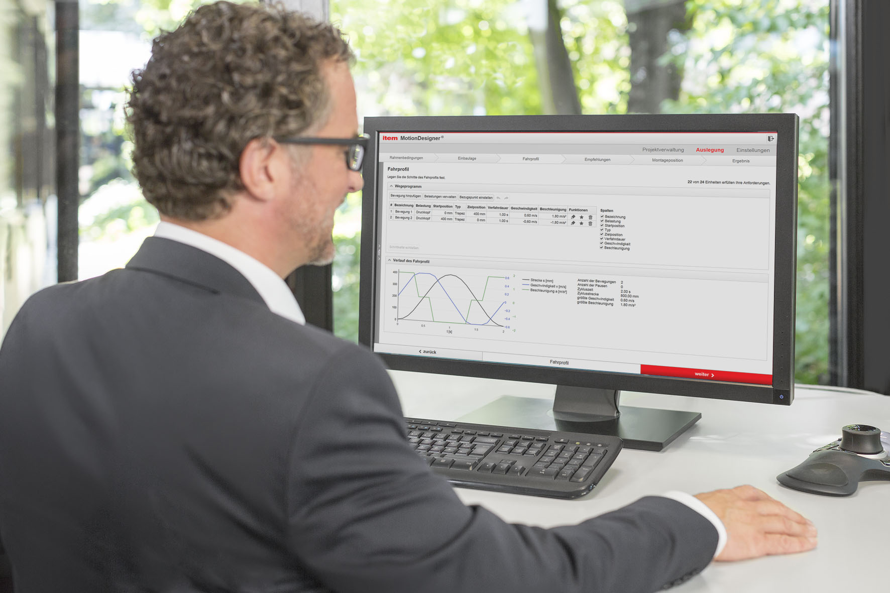 Intelligent item MotionDesigner® selection and design software can be used to configure linear motion units® as automation solutions in just a few steps. The system uses an input mask to query technical specifications. Once the customer has specified basic conditions, the mounting location and the motion profile for the transport task in question, the program runs through thousands of possible combinations to find potentially suitable item linear motion units® as a turnkey solution. item MotionDesigner® is web-based and does not need to be installed locally. The software is therefore always up to date.